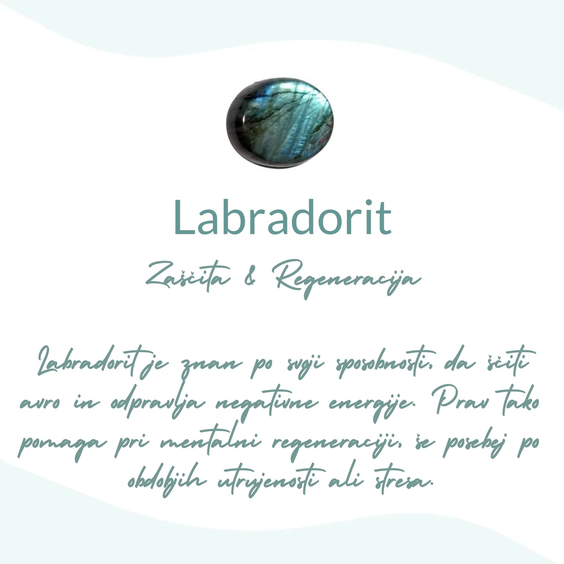 Pravi je zaščitni kamen, ki vas ščiti pred negativnimi energijami in projekcijami, usmerjenimi proti vam. Deluje kot ščit – absorbira bolečino, žalost in druge negativne energije, jih raztaplja ter vas osvobaja. Labradorit prav tako pomirja hiperaktiven um in spodbuja domišljijo.